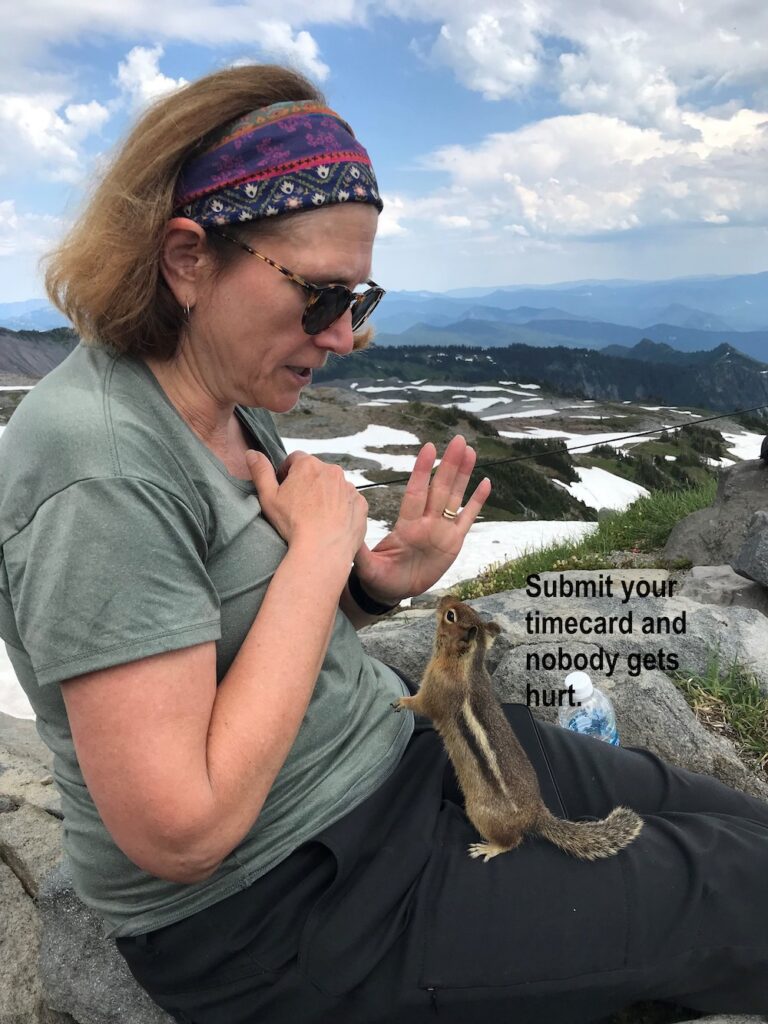 Our administrator replied to my email saying she loved the picture and would attach it to the next timecard reminder. A few weeks later, I submitted a second image starring that same Washington State chipmunk.